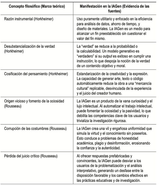 El artículo ha demostrado cómo la inteligencia artificial generativa, lejos de ser un avance tecnológico neutral, es una manifestación de profundas tensiones éticas y filosóficas que se remontan a la modernidad. Al encarnar la razón instrumental de Horkheimer (1947/1973), la IAGen reduce el conocimiento a una mera calculabilidad y, al operar bajo la lógica del progreso sin virtud, como temía Rousseau (1750/2001), puede corroer la autenticidad y el juicio humano.