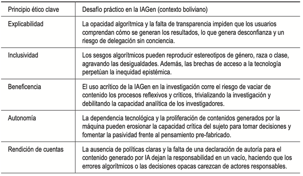 El análisis de Runcan et al. (2025) critica la tendencia a adoptar principios éticos abstractos sin mecanismos de implementación reales, un fenómeno que se ha denominado “ethics washing”. Estos marcos, que a menudo son retóricos y carecen de mecanismos de fiscalización, tienen un sesgo epistémico que ignora las voces y los saberes no occidentales, haciendo que las soluciones sean irrelevantes para contextos como el boliviano. Si el desarrollo de la IAGen está dominado por visiones tecnocráticas y occidentales y la adopción en contextos como el boliviano es pasiva y sin la formación adecuada, la IAGen podría convertirse en un mecanismo para importar y solidificar un sesgo epistémico ajeno. El conocimiento producido, si es generado acríticamente con la herramienta, reproducirá y perpetuará los mismos sesgos culturales y epistemológicos que los marcos éticos dominantes no logran abordar.
