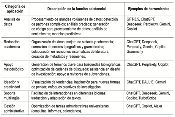 La integración de la IAGen en la investigación no se limita a hacer las tareas existentes más rápidas o eficientes. Sus capacidades para procesar vastas cantidades de información, identificar patrones complejos y sugerir nuevas perspectivas implican que la IAGen puede reformular preguntas de investigación y ampliar las formas de interpretar fenómenos sociales. Esto significa que la IAGen no es solo un medio para un fin preexistente; puede influir o incluso expandir los fines de la investigación misma. Esta función transformadora convierte a la IAGen en un amplificador epistémico, capaz de extender el alcance y magnificar la capacidad del investigador humano, lo que exige una nueva forma de alfabetización epistémica para aprovechar su potencial mientras se mantiene la supervisión crítica. A continuación, se presenta una tabla que resume las aplicaciones asistenciales de la IAGen en la investigación, incluyendo ejemplos de herramientas y sus referencias: